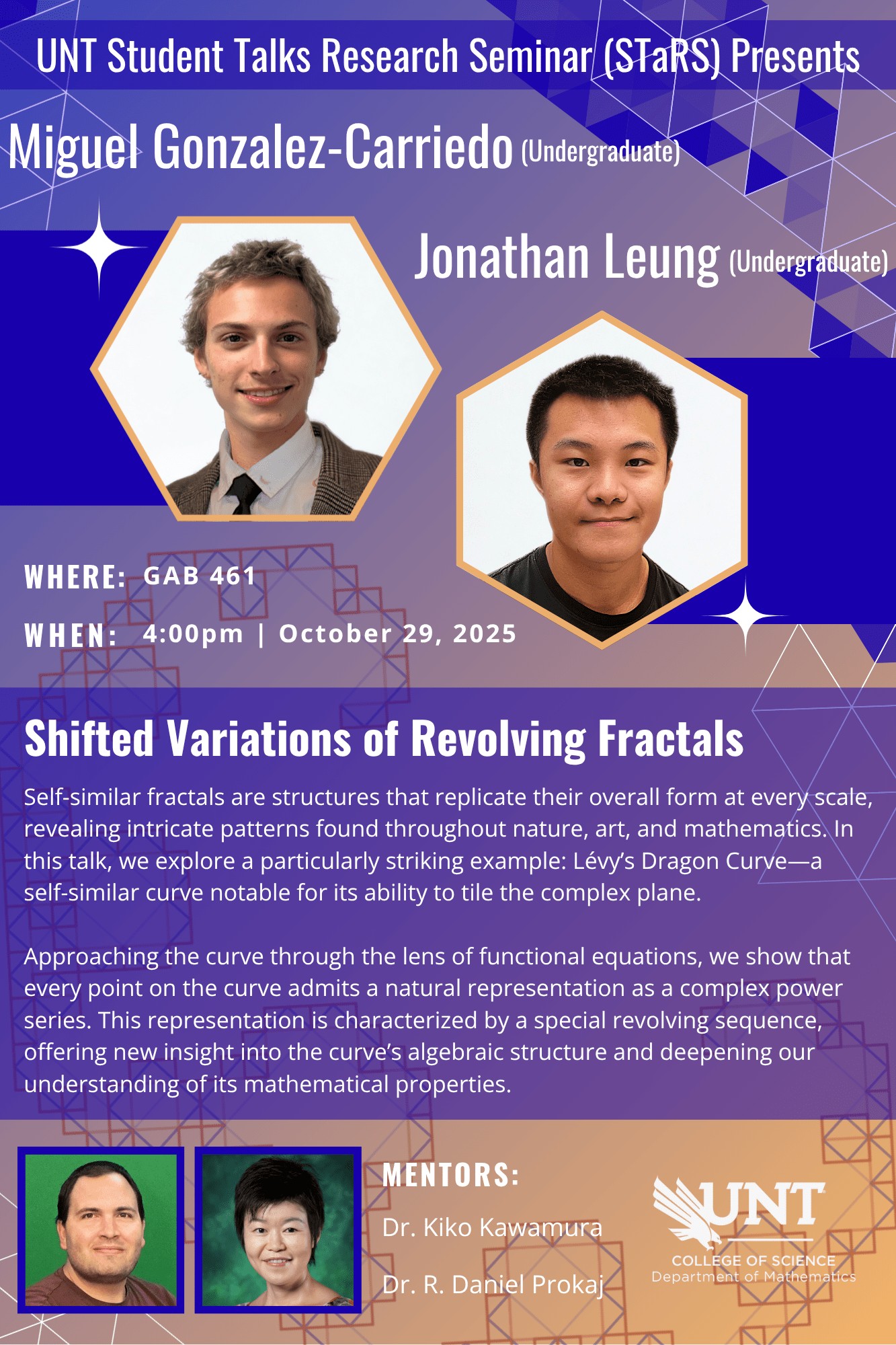 | 2025-10-29 | Miguel Gonzales-Carriedo (Undergraduate), Jonathan Leung (Undergraduate) | Dr. Kiko Kawamura, Dr. Rudolf Prokaj | Shifted Variations of Revolving Fractals |